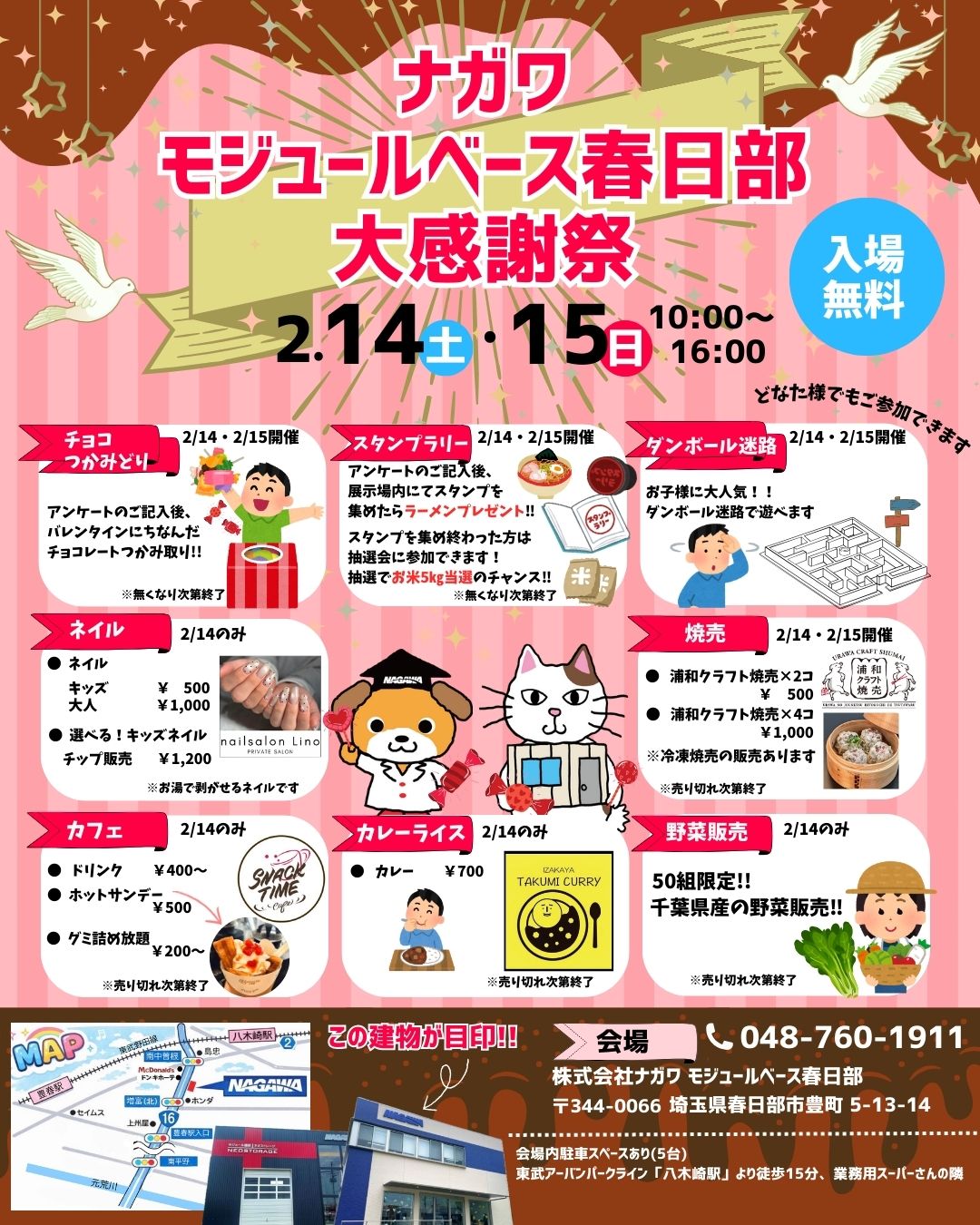2/14(土)・2/15(日)モジュールベース春日部にて「ナガワモジュールベース春日部大感謝祭」を開催します。カレーライスや焼売、ネイル体験や千葉県産の野菜販売いたします。バレンタインにちなんだチョコレートつかみ取りや、スタンプラリー、ダンボール迷路など、お子様もお楽しみいただけます!